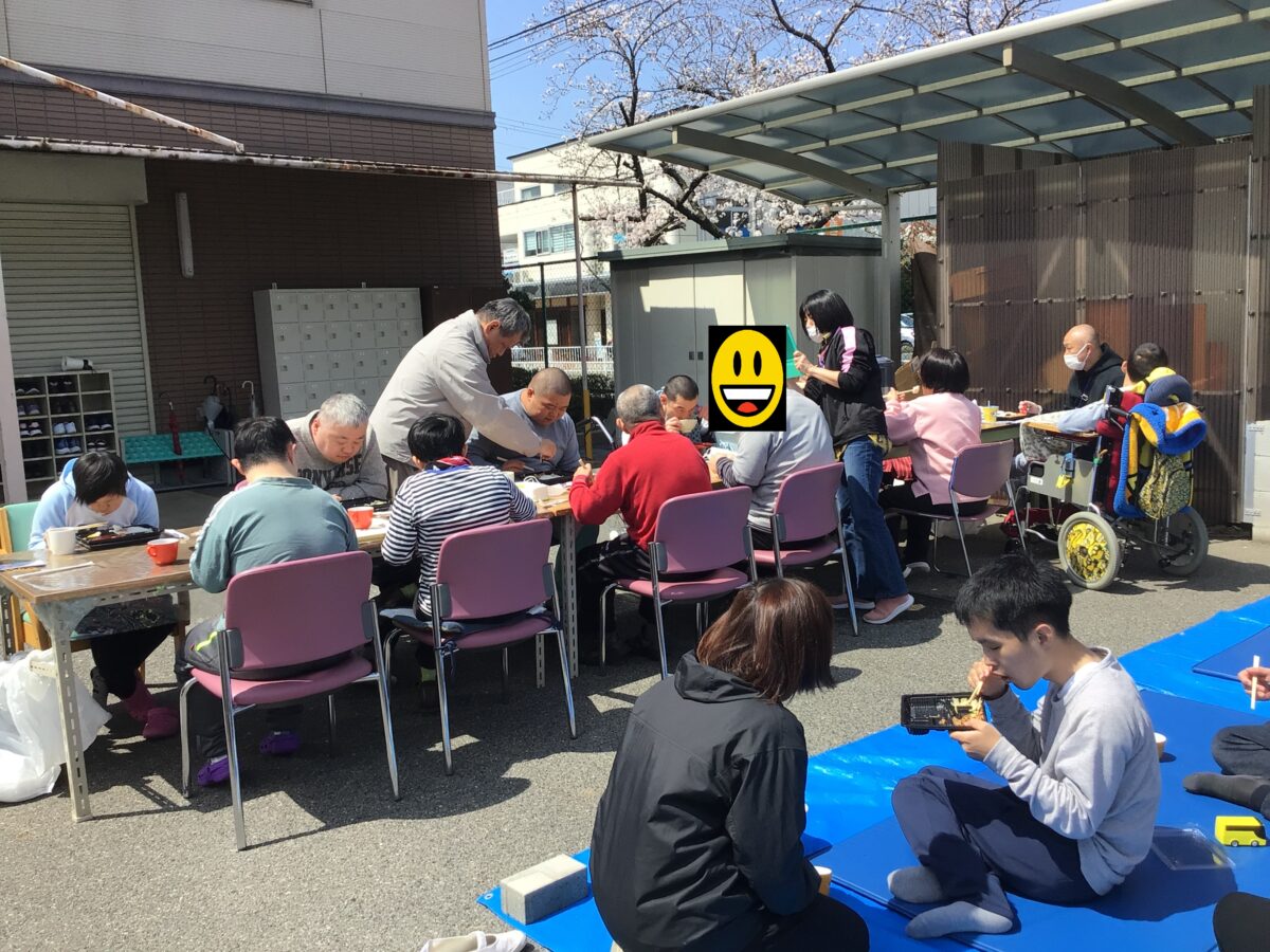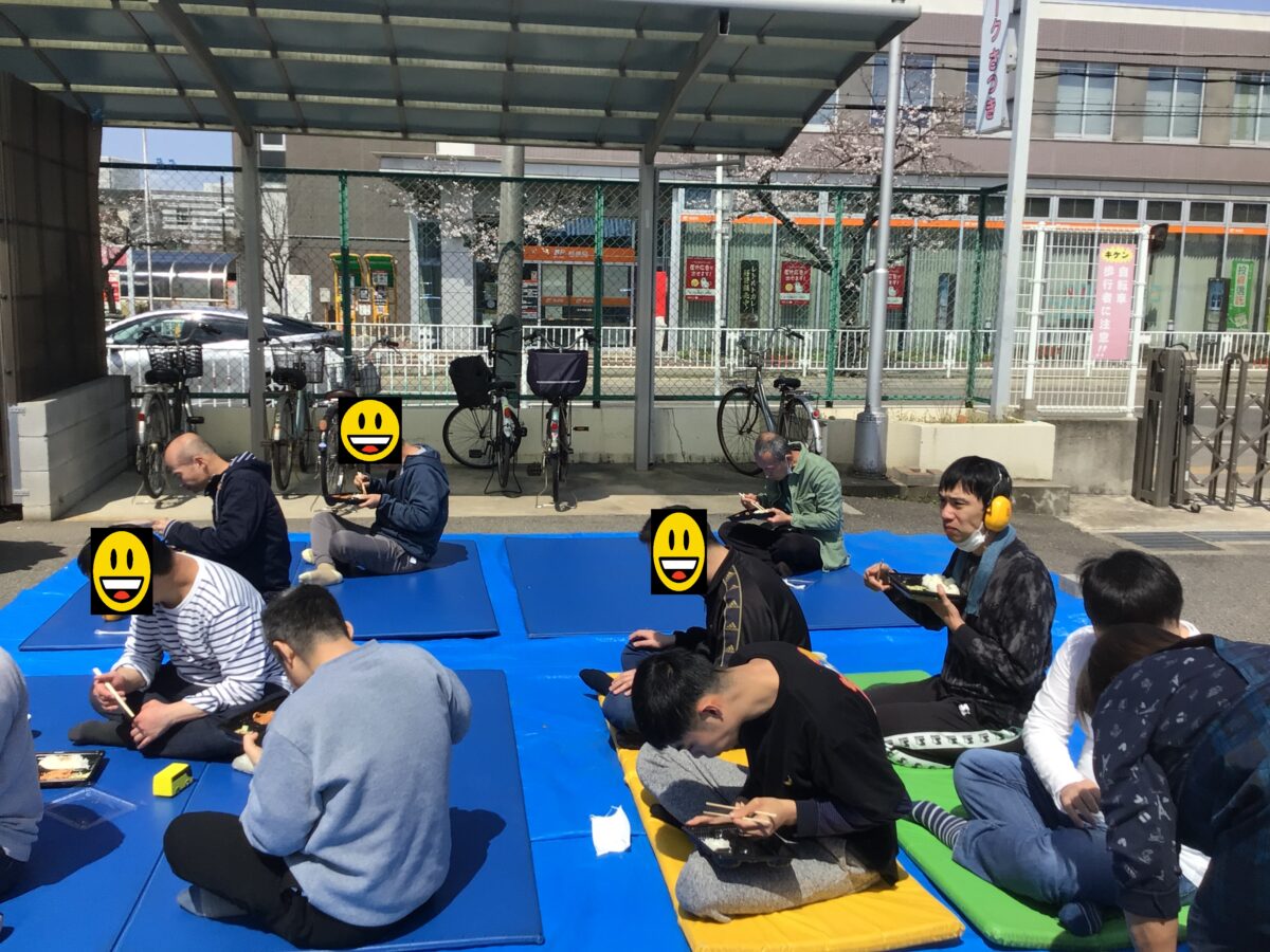 毎年ワークさつきでは桜をバックに記念写真を撮るのですが、桜が咲くのを見て利用者の皆さんが「きれいやなー」と話しているのを何度か耳にしており、せっかくなら今回はそのきれいな桜を見ながらお弁当を食べ楽しんでいただこう!と思いお花見を企画しました。