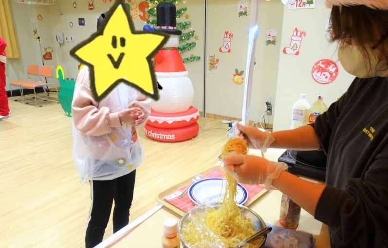 そんな子どもたちにも、「本物の屋台の雰囲気を味わってほしい!屋台の美味しい料理を食べて欲しい!」という職員の思いで、室内に屋台を作り、クリスマス会を実施しました。