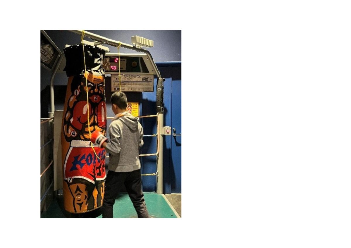 パンチングマシーンと格闘している子も。